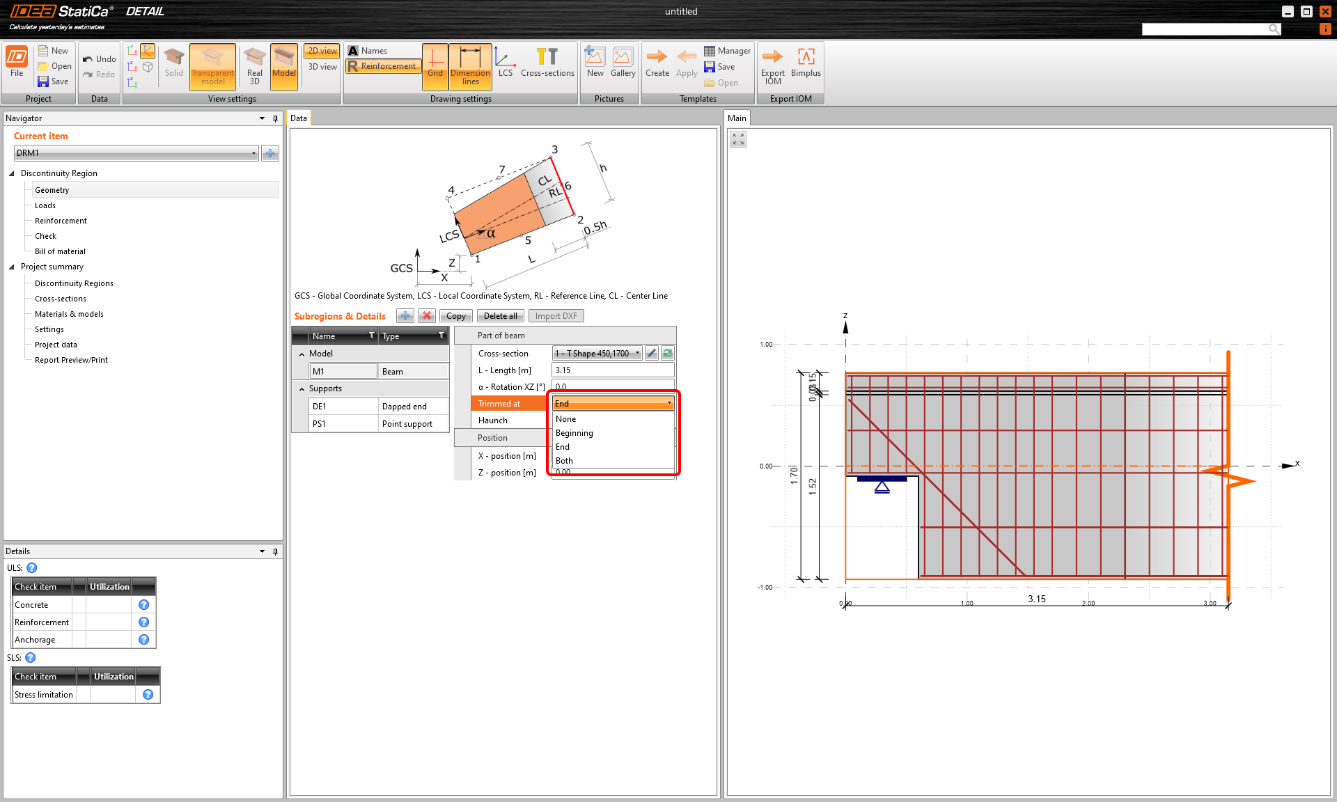 Let's say you have already designed and checked the reinforcement in the B-regions, and you want to focus on the discontinuity regions of the beam only, so you won't spend additional time modeling the whole beam. No problem! In this case, it is recommended to model the trimmed beam.