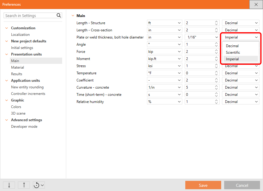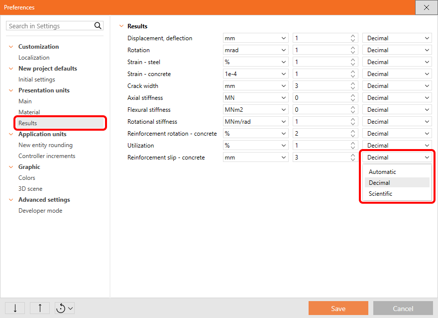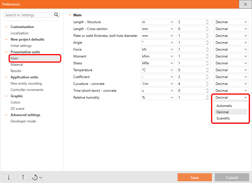 The system of units, their precision, and format can be changed anytime during your work in IDEA StatiCa. The presented settings apply for Connection, Member, Checkbot and Detail.