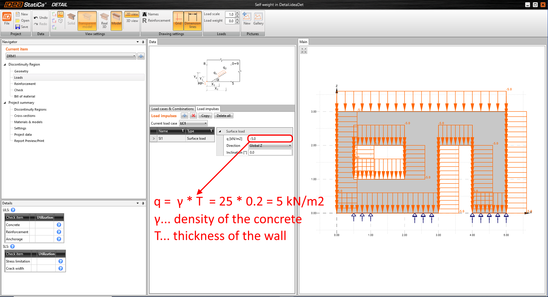 - The self-weight is counted as the density times the thickness of the wall.