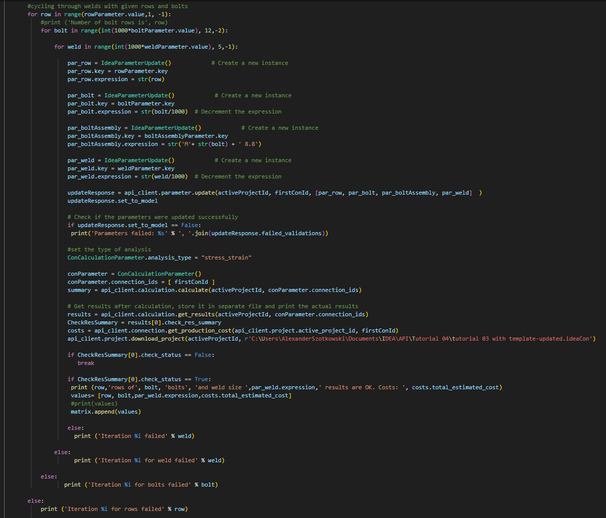 - Now, we start a cycle by changing the welds (from t = 8 to 5 mm), bolt diameter (from M16 to M12), and number of rows (from 3 to 1). The numbers 8, M16, and 3 are values taken from the ideaCon file. The ongoing results are printed on the screen and also added to the list of results.