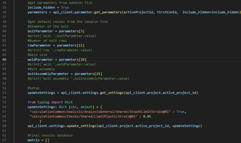 - Retrieve all needed parameters from the ideaCon (number of bolts, diameter, weld size, bolt assembly)