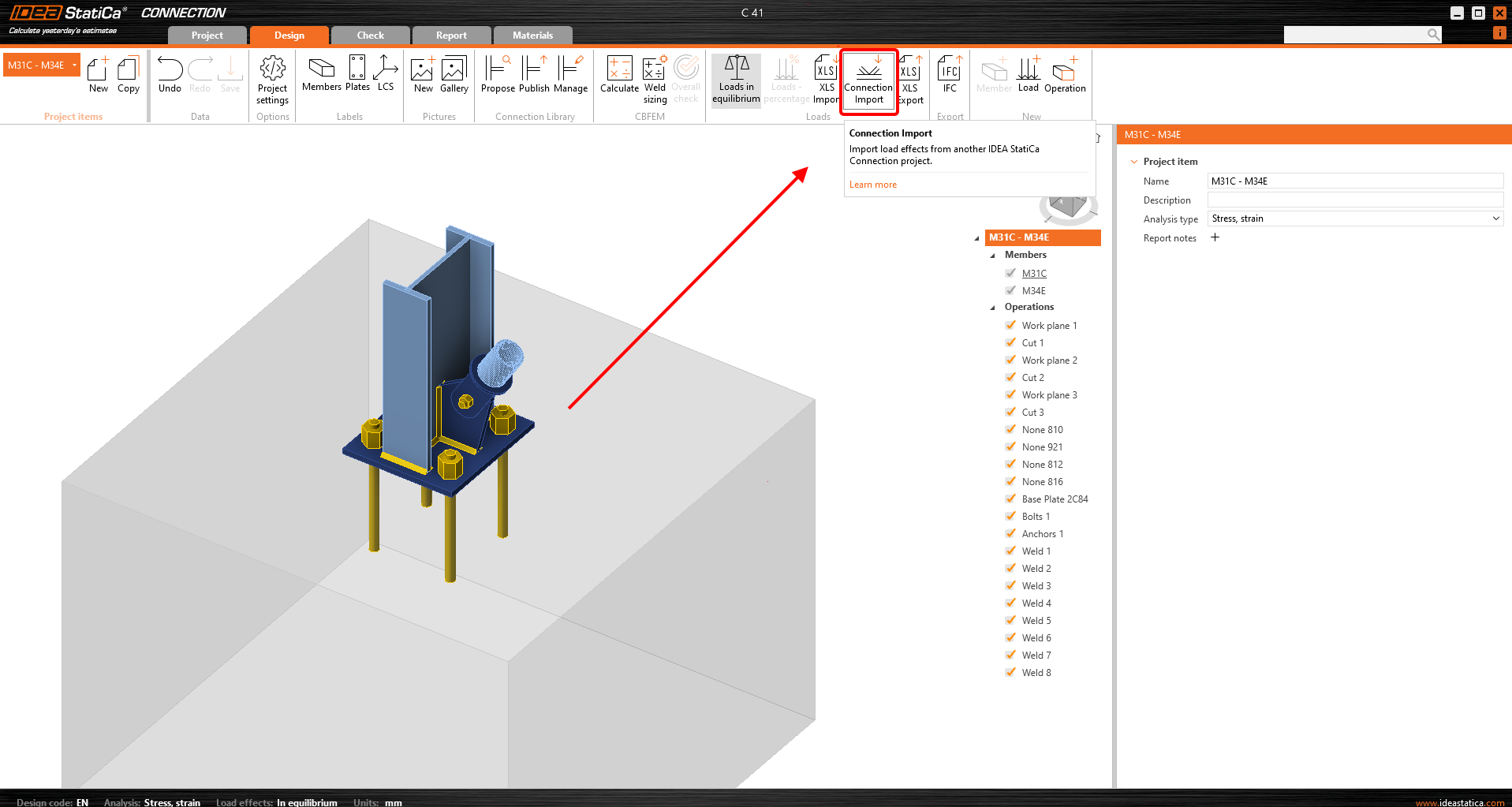 If the topology of the connections you want to merge differs (e.g., a different number of members or variations in member rotation), the software will issue a warning, and nothing will be imported. Additionally, the "Loads in Equilibrium" option (ensuring unbalanced forces = 0) serves as a verification tool for you.