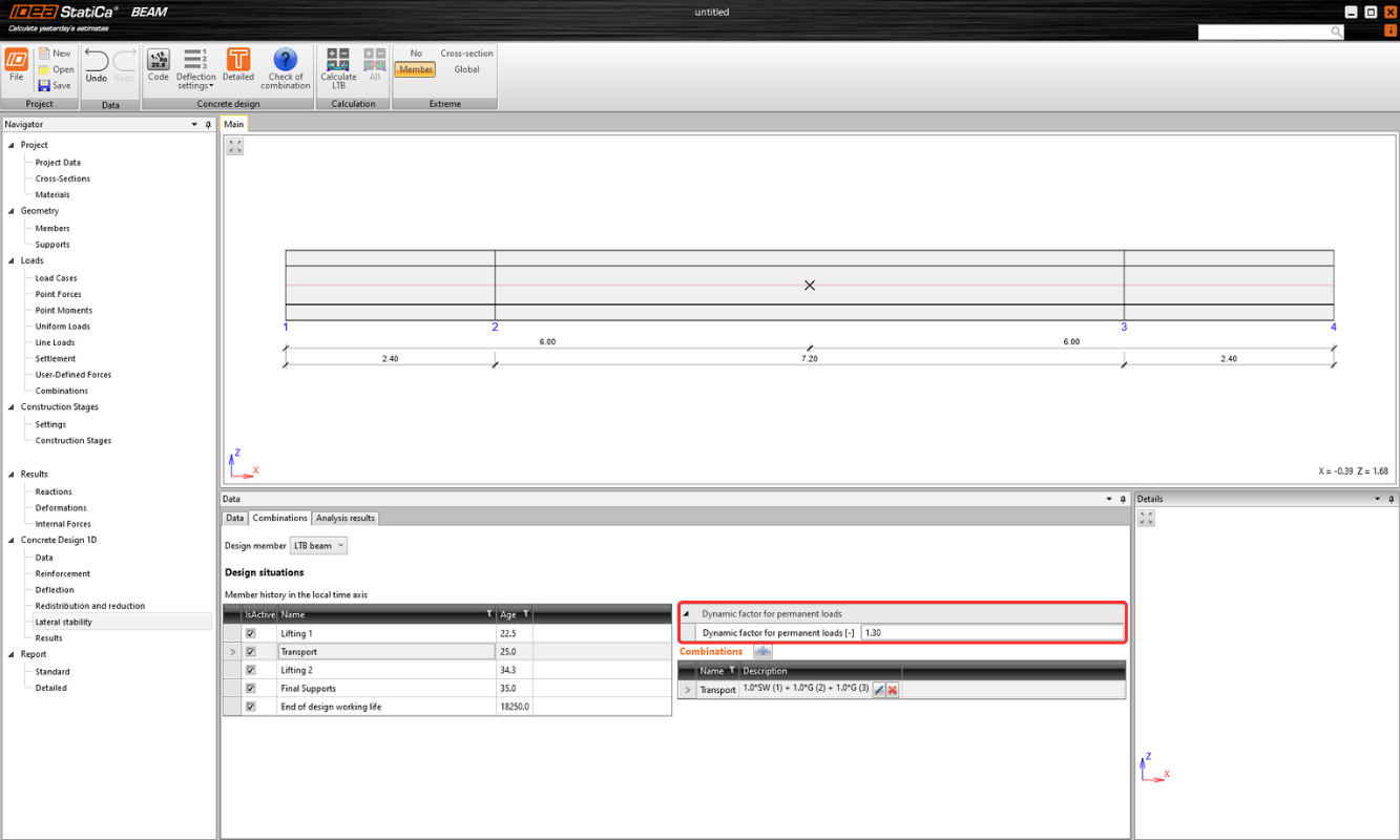 The "Loads" section in the tree of entities in previous design steps defines all the load cases, loads, and load factors. In the section Lateral Stability, dynamic factors for lifting and transport phases and correct non-linear ULS combinations for each Design situation must be defined.