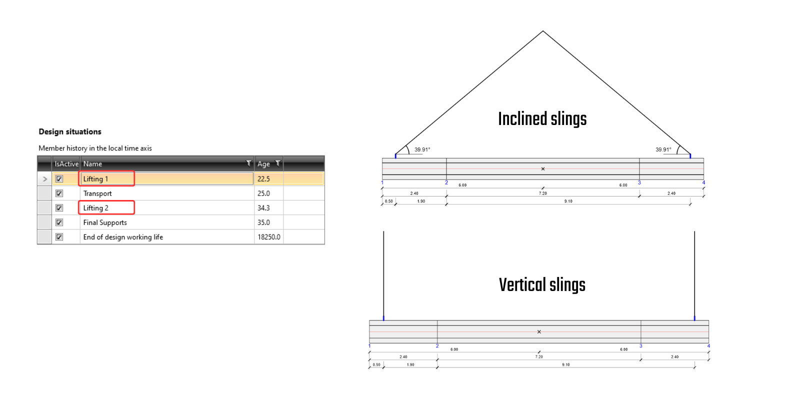 Two types of lifting can be defined: vertical slings or inclined slings, each with specific calculation conditions. The position of the lifting points must be specified in both the longitudinal and transverse directions of the beam.
