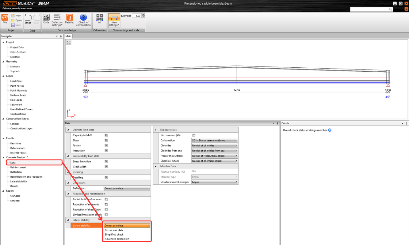 The option can be selected in the Design 1D – Data section next to the Simplified Check and Do Not Calculate options. All necessary input belongs to the Lateral Stability section. In the case of simplified verification, only the basic dimensions need to be entered. For advanced analysis, more detailed input is required, including construction history, imperfections, and other parameters.