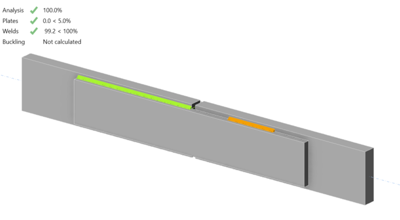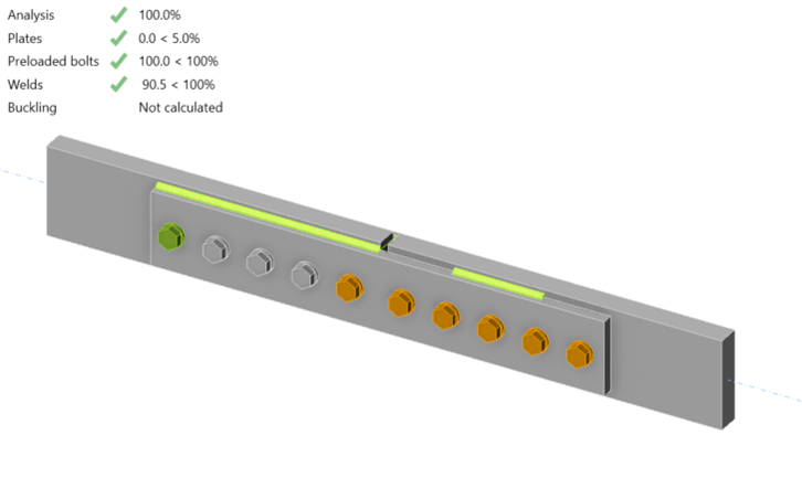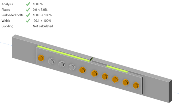 Strength checks for bolts and welds are independent in IDEA StatiCa with no special handling of when bolts and welds share load. Given the explicit modeling of the stiffness of bolts, welds, members, and connecting elements, strain compatibility is always considered in IDEA StatiCa. When bolts and welds share load, the required strength of each is based on their relative stiffness and the available strength is computed as usual. The validity of this approach can be established through comparison.