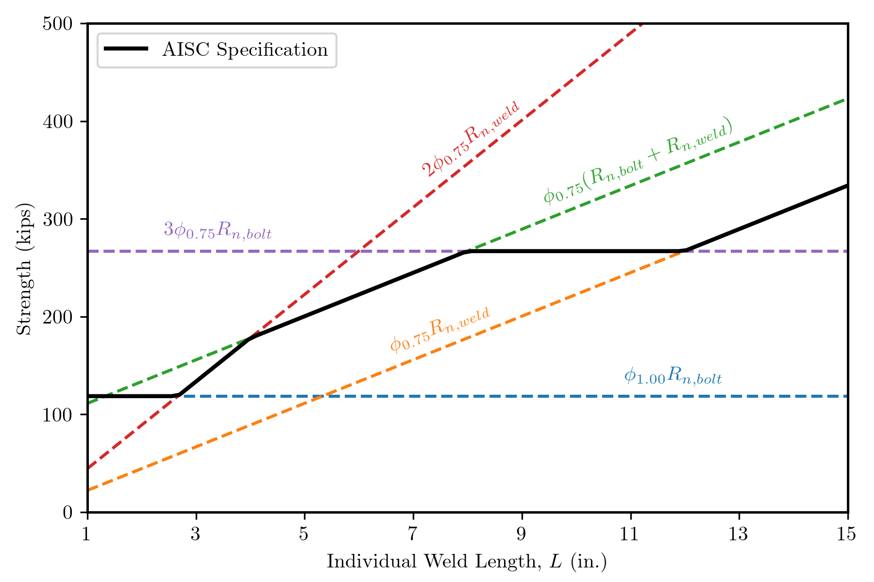 Ru ≤ ϕRn,eff = min[ ϕ(Rn,bolt + Rn,weld) , 2ϕRn,weld , 3ϕRn,bolt]