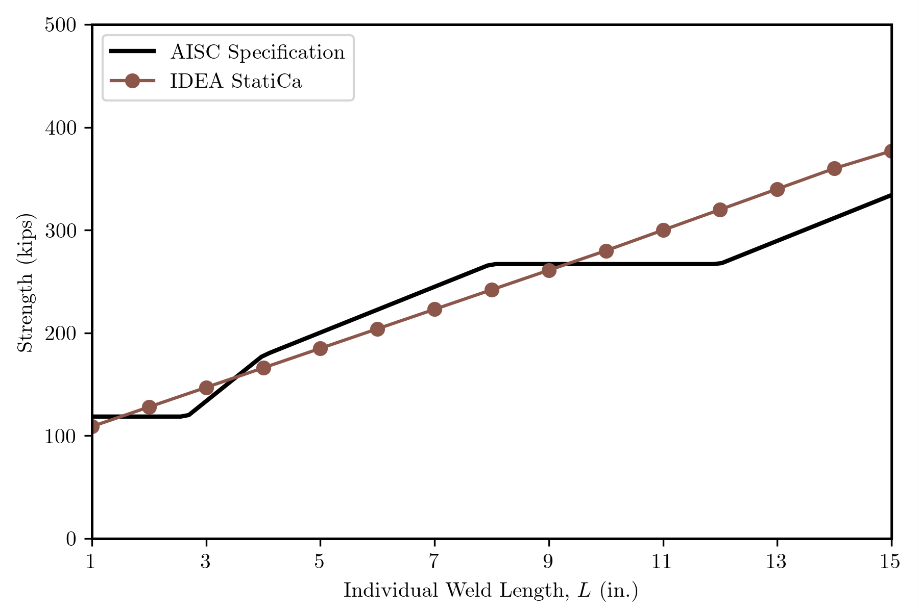 The IDEA StatiCa and AISC Specification strengths are plotted together below. They show similar trends of generally increasing strength with increasing weld length. For some weld lengths, the IDEA StatiCa strength is greater, for other weld lengths the AISC Specification strength is greater.
