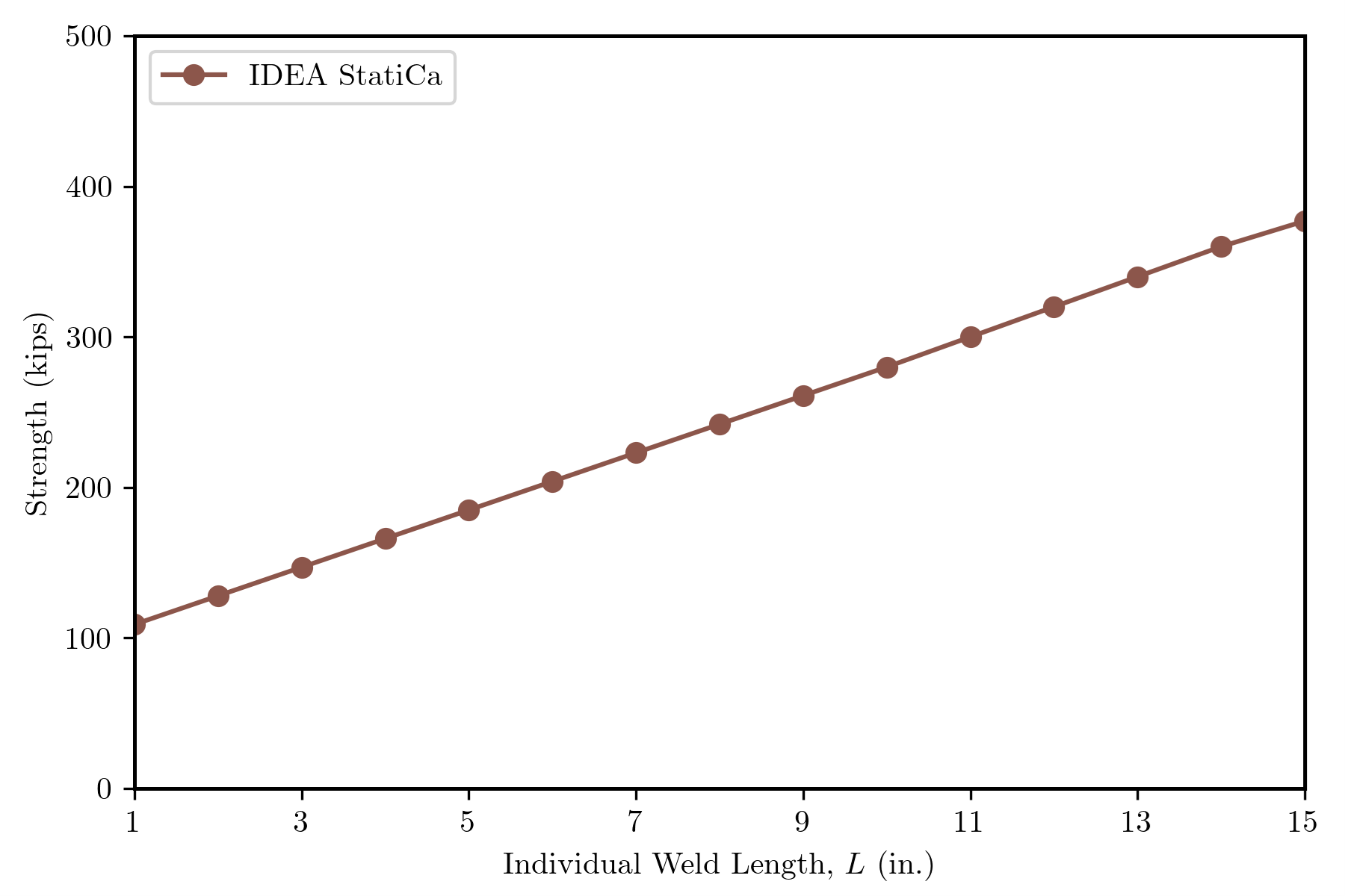 The strength from IDEA StatiCa is plotted in the figure below. It increases linearly with weld length.