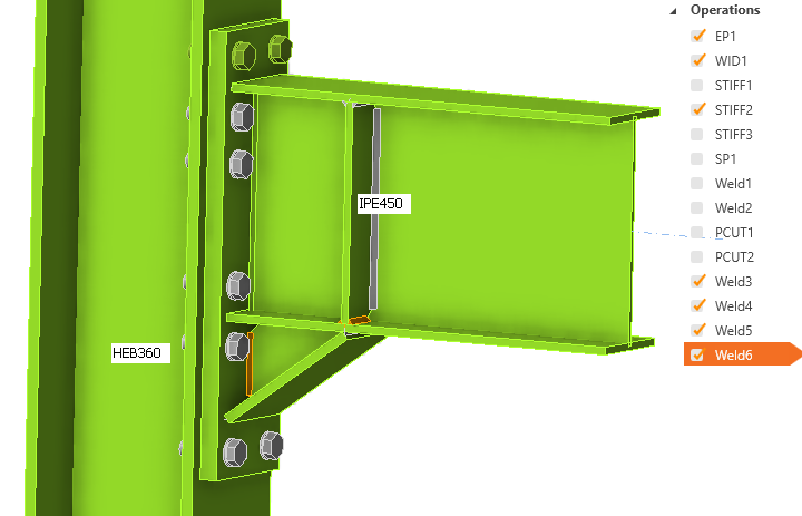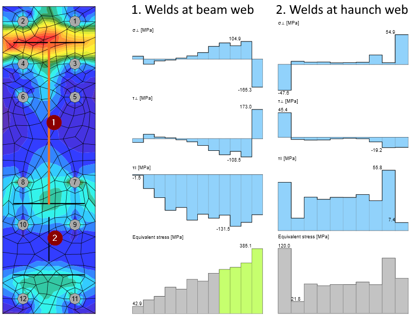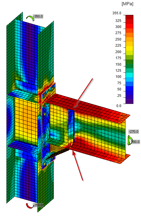 The shear and normal stresses are transferred into the end plate via welds. Full-penetration butt welds are used for critical welds of flanges. Fillet welds are used at the web where the welds are less loaded.