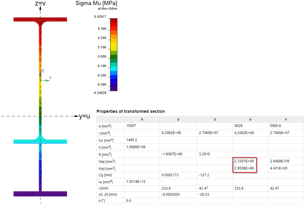 The stress in the beam can be calculated using elastic or plastic section modulus. Using elastic section modulus, we obtain: