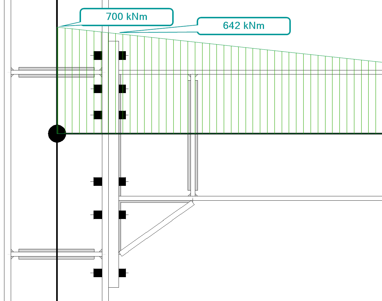 Shear forces induce a moment gradient in the beam. For moment connections, such as flange plate connections, that occur over a length of the beam, the moment is not constant. In hand calculations, the moment gradient is often conservatively neglected, and a single value of moment is used regardless of the length of the connection. The moment gradient cannot be neglected in IDEA StatiCa since the analyses ensure equilibrium and thus must be properly defined to be consistent with the structural analysis from which the required strengths were obtained. The specified moment will occur where defined by the “Forces in” option in the member menu.
