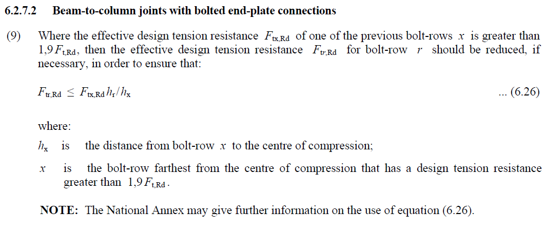 • The shear force is transferred via shear in bolts to the column flange and the bending moment via the lever arm of two forces – tension through the bolt tension in the bolt rows near the top flange and compression via contact between end plate and the column flange.