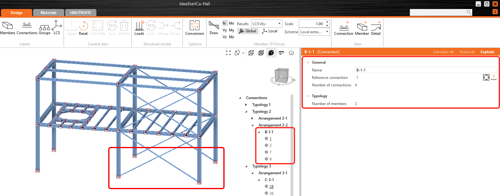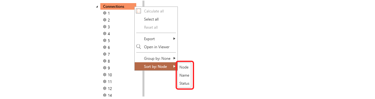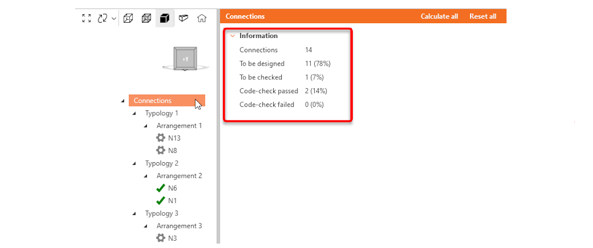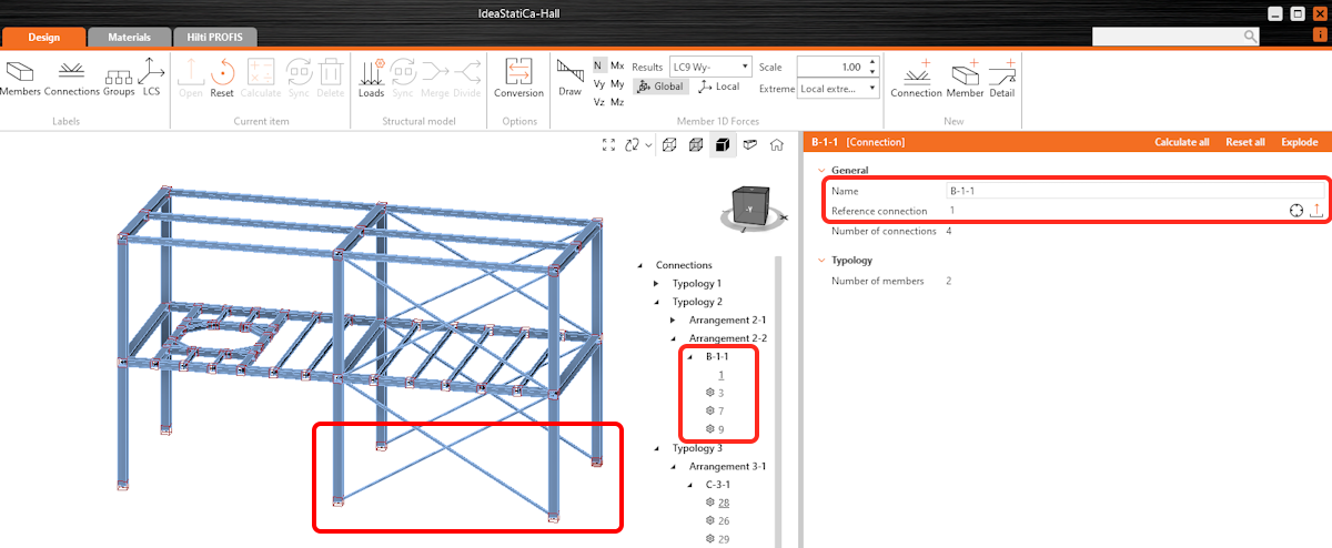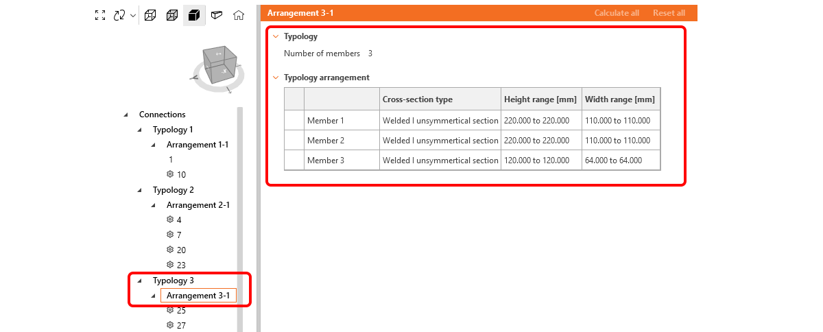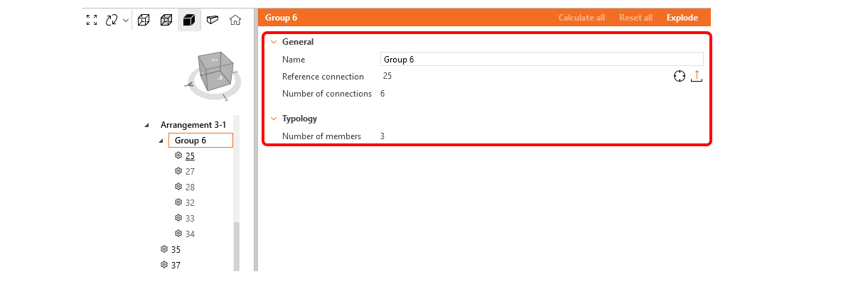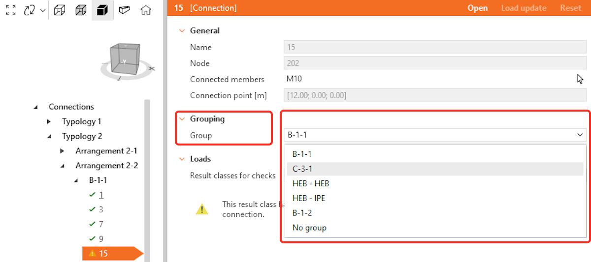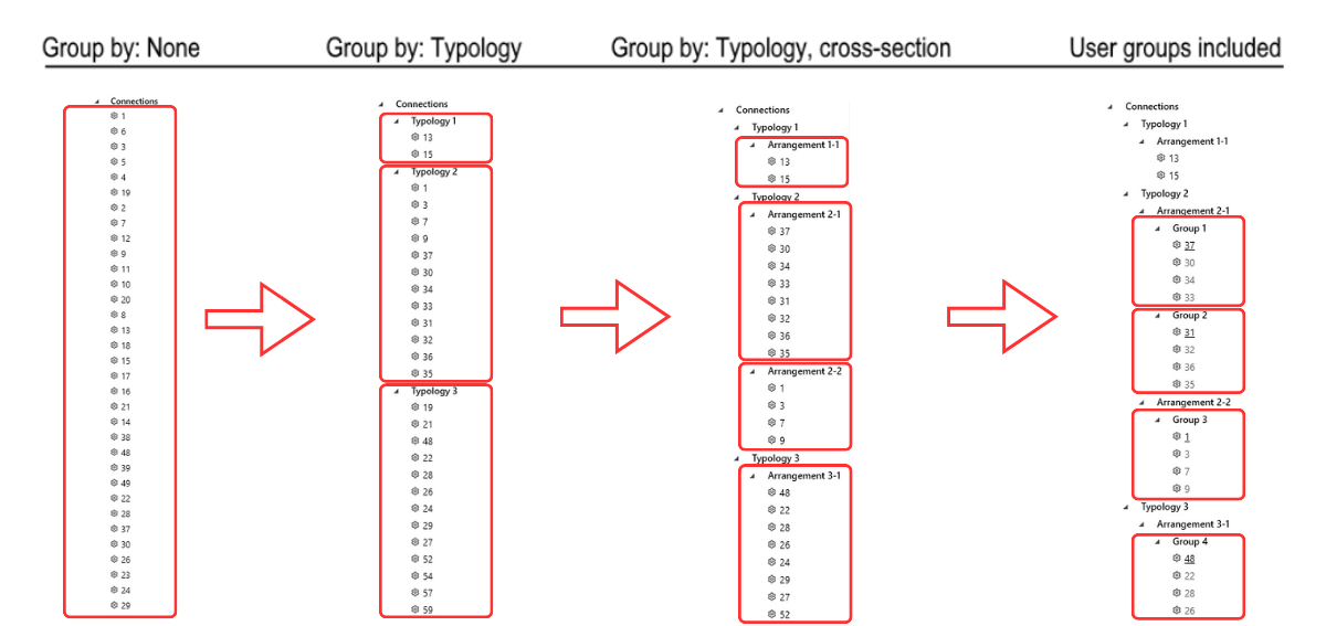 Users can add a third level of grouping, defined as design groups.These groups allow for further customization, enabling users to organize specific sets of connections based on their project needs. The only condition is that connections within the same design group must share the same typology and cross-section. The connection tree can have four different ordering options based on the level of grouping.