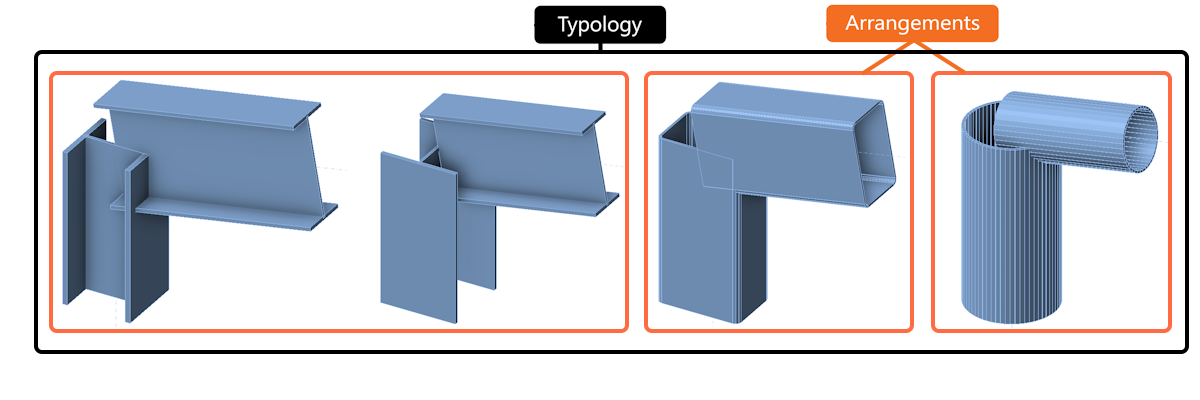 • Typology, cross-section (Arrangement) – within the same typology, connections are further grouped by cross-section type. This is the lowest similarity that is required to enable searching for similar designs in the Connection Library.