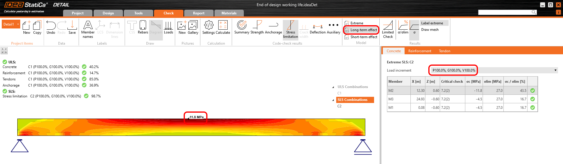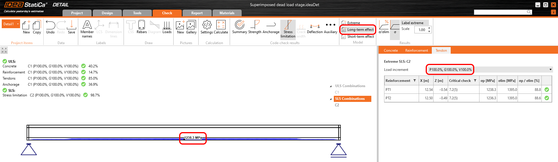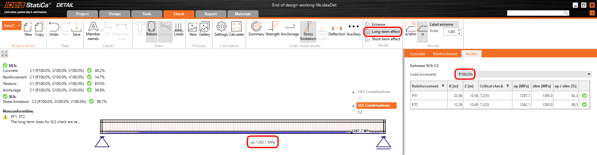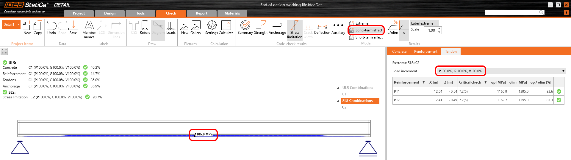 The long-term losses can be calculated as σ∞ / σdet,∞ = 1100 / 1267 = 0.868 -> long-term loss is 13.2%. The value of σ∞ is determined in The beam parameters chapter in the Tendon Stress/Losses chart. Let's input the value and compare the results.