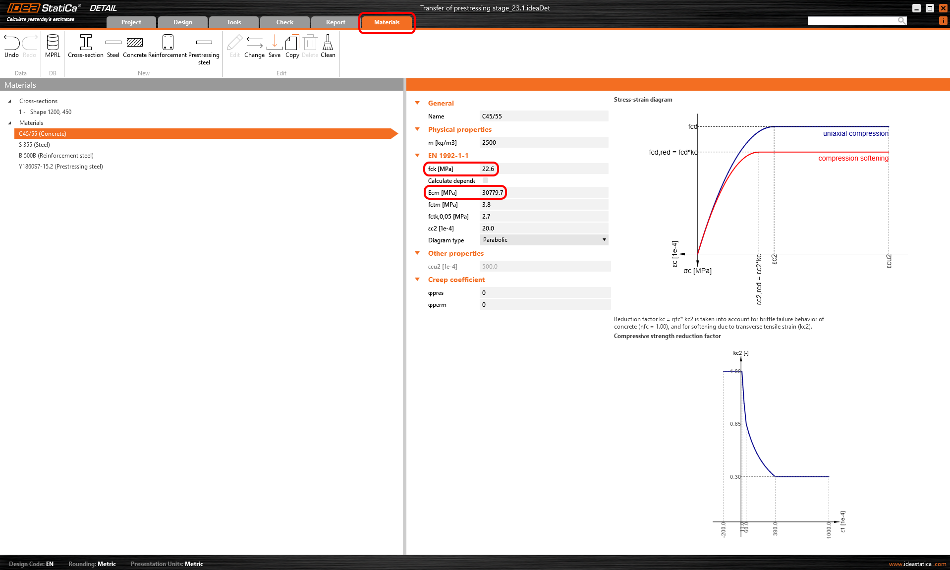 - In the Detail application approach, the whole ULS is calculated with the material model where the modulus of elasticity is calculated from fcd (also influenced by ηfc factor, see Material models (EN)). It causes greater elastic strain and consequently greater loss Δσpe. Please recall that we input the stress before loss due to immediate elastic concrete strain. This loss is calculated based on the strain of the model affected by prestressing forces (in the case of ULS with the lower modulus of elasticity).