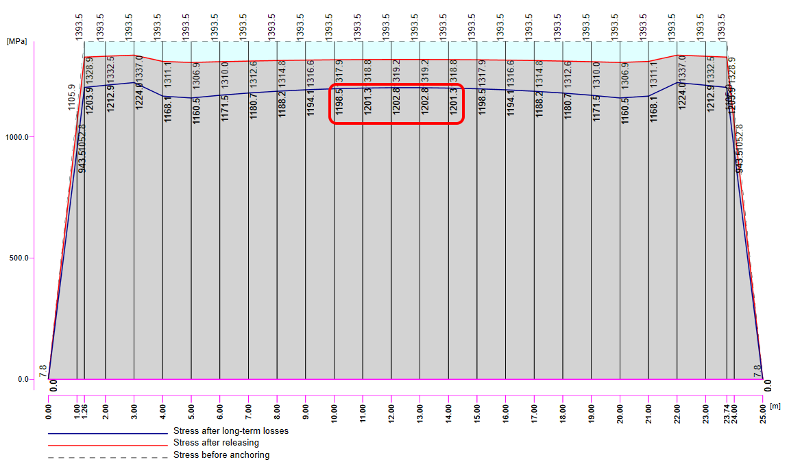 - σpr,cor - Stress after short-term relaxation that also includes anchorage set loss and loss due to the deformation of abutments. In our example σpr,cor = 1415 MPa
