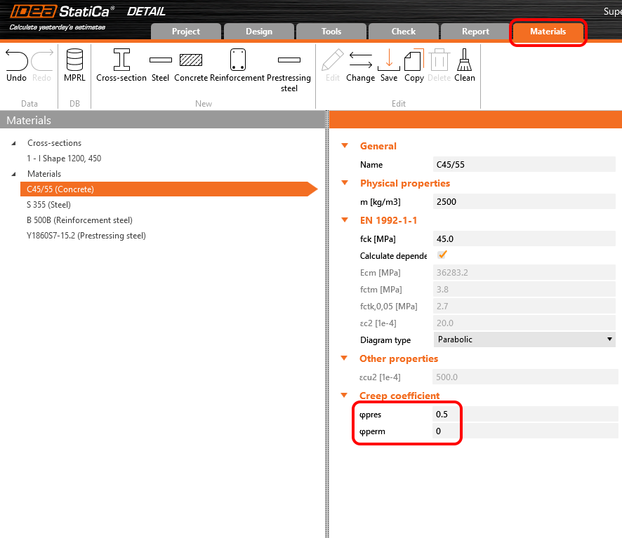 In the Detail application, the creep coefficient can be set in Materials & models. It is obvious that the modulus of elasticity has to be set as the default Ecm value (recall the Increment chapter and the chart in it). You will also notice that the value of φperm = 0.0, which is because we want to apply permanent loads as short-time loads as well as variable loads.