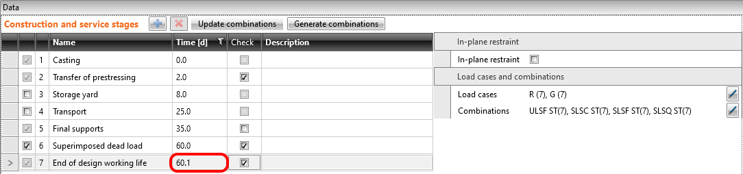 The time (age of the concrete) for this stage is 60 days. The purpose of this stage is to check the concrete beam at the start of its working life including permanent and variable loads. So the other two load cases are added. Load impulses are of course the same as in the Beam application model.