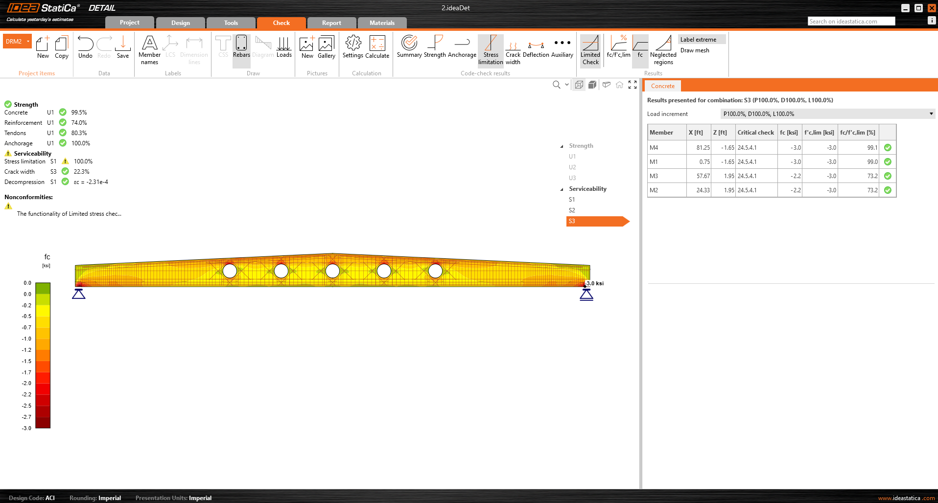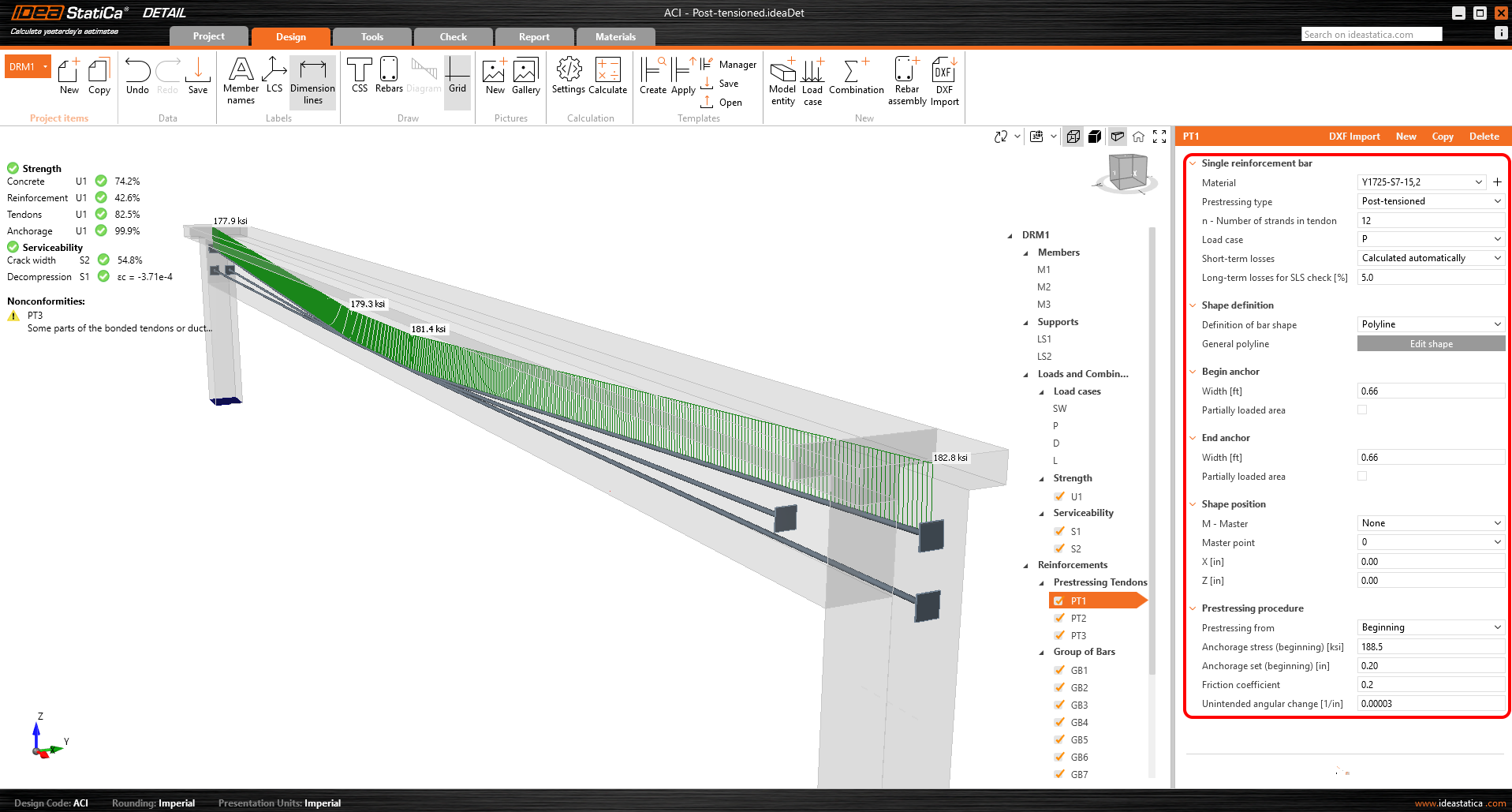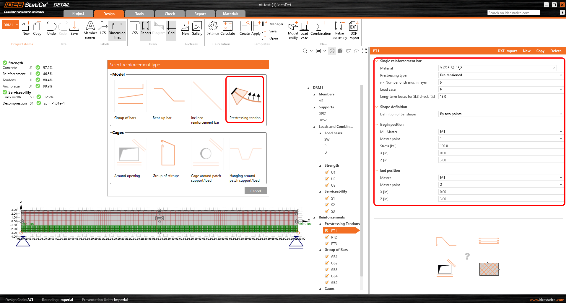 Detail for ACI code supports the design of prestressed elements, including precast beams, deep beams, and girders. It also supports retrofitting of existing structures such as corbels, brackets, etc., for example, with prestressing bars.