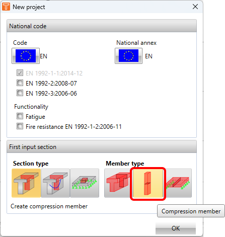 This type is meant for a slender compressed member where the second-order effect is significant. Hence typical cross-section templates for columns are available. Two analysis methods according to EN 1992-1-1 5.8 are implemented - Nominal stiffness and Nominal curvature.