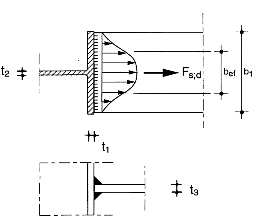 In the weld calculation of statically loaded structures it is then allowed to assume a uniform stress distribution over the thickness and along the length of the weld. Here it is also implicitly assumed however that plastic strains can occur to make redistribution of stresses possible. The needed deformation capacity increases as the weld length increases. The ultimate strain is still considered limited however, thus in certain situations one will have to take into account an effective width beff, for example in a joint where a transverse plate (or beam flange) is welded to a supporting unstiffened flange of an I-profile (Figure 3).