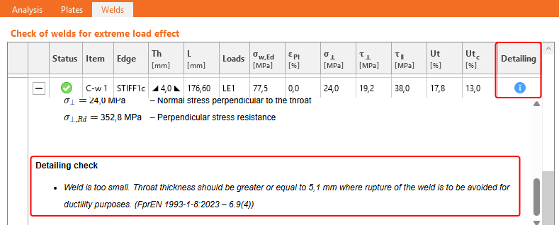 EN 1993-1-8 in Cl. 4.9(4)-(6) further states additional requirements for welds in joints. The idea behind these rules is that a joint should be prevented to fail without sufficient warning. Even if one can show that plastic strains can occur in welds, and that the weld is in principle sufficiently strong to resist the occurring forces which are determined in a general (static) calculation, it might still be the case that the occurring forces are larger than expected and could lead to failure of the joint as a whole without sufficient warning. This is because the total elongations in a weld may still be small in an absolute sense. Sufficient warning effect may then be obtained by designing the joint in such a way that the connected plate can yield before the weld ruptures. This can be achieved by applying a minimum weld thickness to plate thickness ratio. Therefore, IDEA StatiCa includes detailing checks to verify whether a weld in the model has a sufficient weld thickness for a given plate thickness.