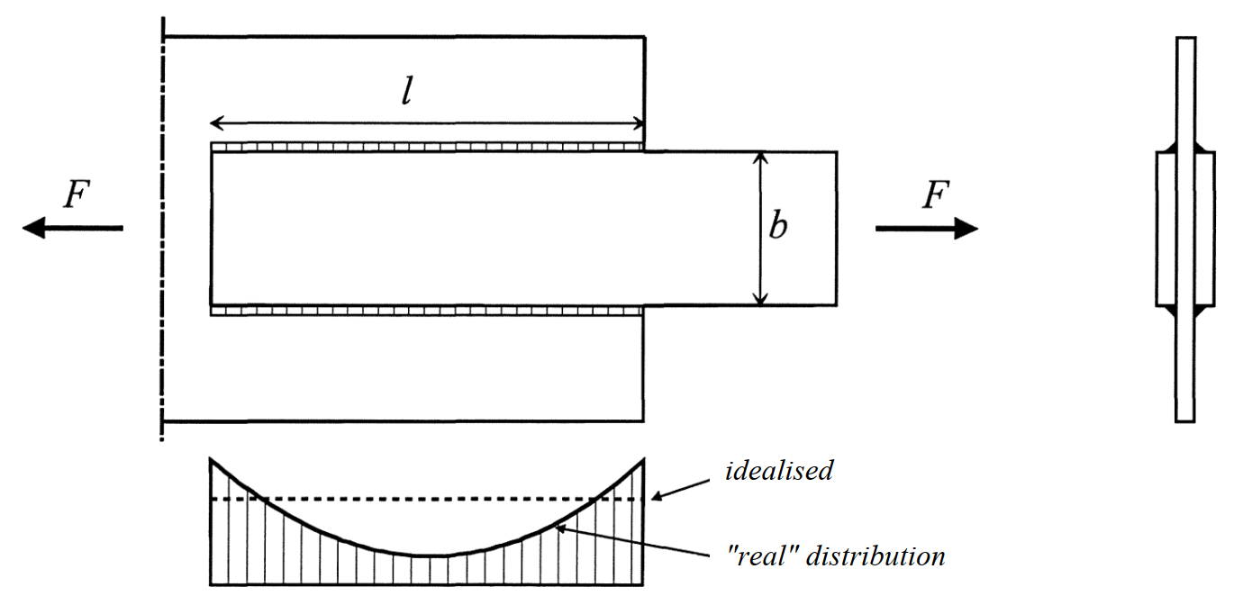 Consider for example the following lap joint which is loaded in longitudinal direction. Similarly to bolted connections that are loaded in longitudinal direction, the stress distribution will not be uniform. Nevertheless, qualitatively one can indicate how the stress distribution would be. The highest stresses occur at the ends