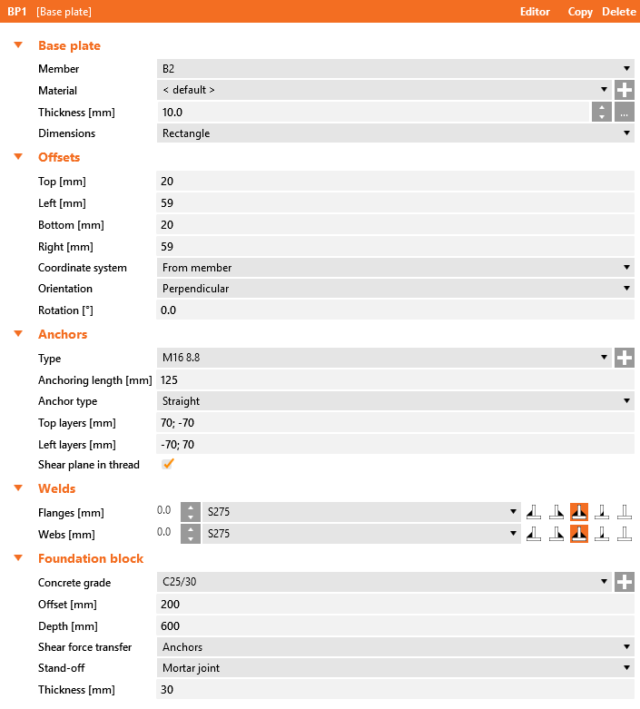 Bisogna ottimizzare la progettazione per trovare la soluzione che sia verificata. Torna nella scheda Progetto, seleziona l'operazione di produzione della Piastra di base e modifica la Lunghezza di ancoraggio in 200 mm e l'Offset del blocco di calcestruzzo in 300 mm, quindi esegui nuovamente l'analisi e le verifiche normative.