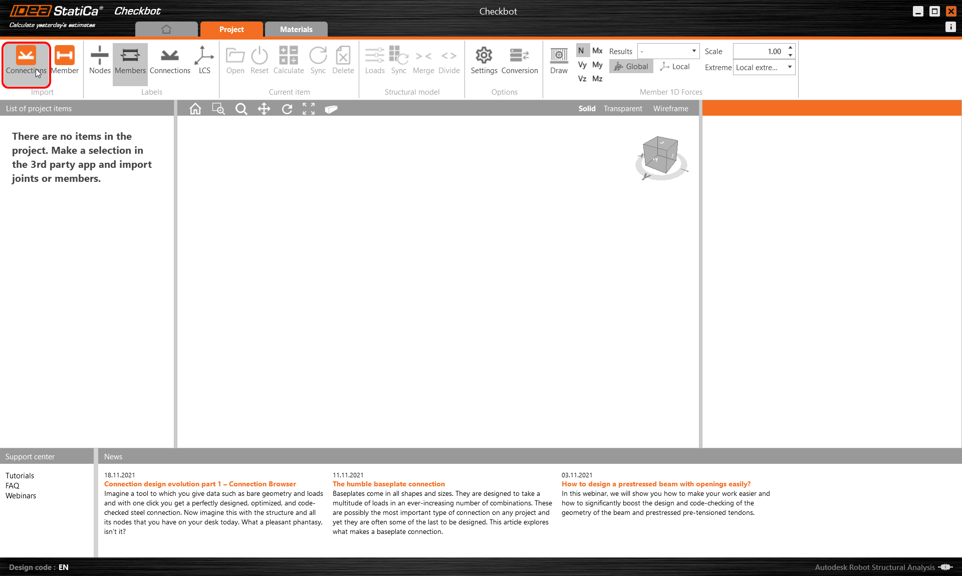 The new Checkbot project is ready to import connections from AxisVM.
