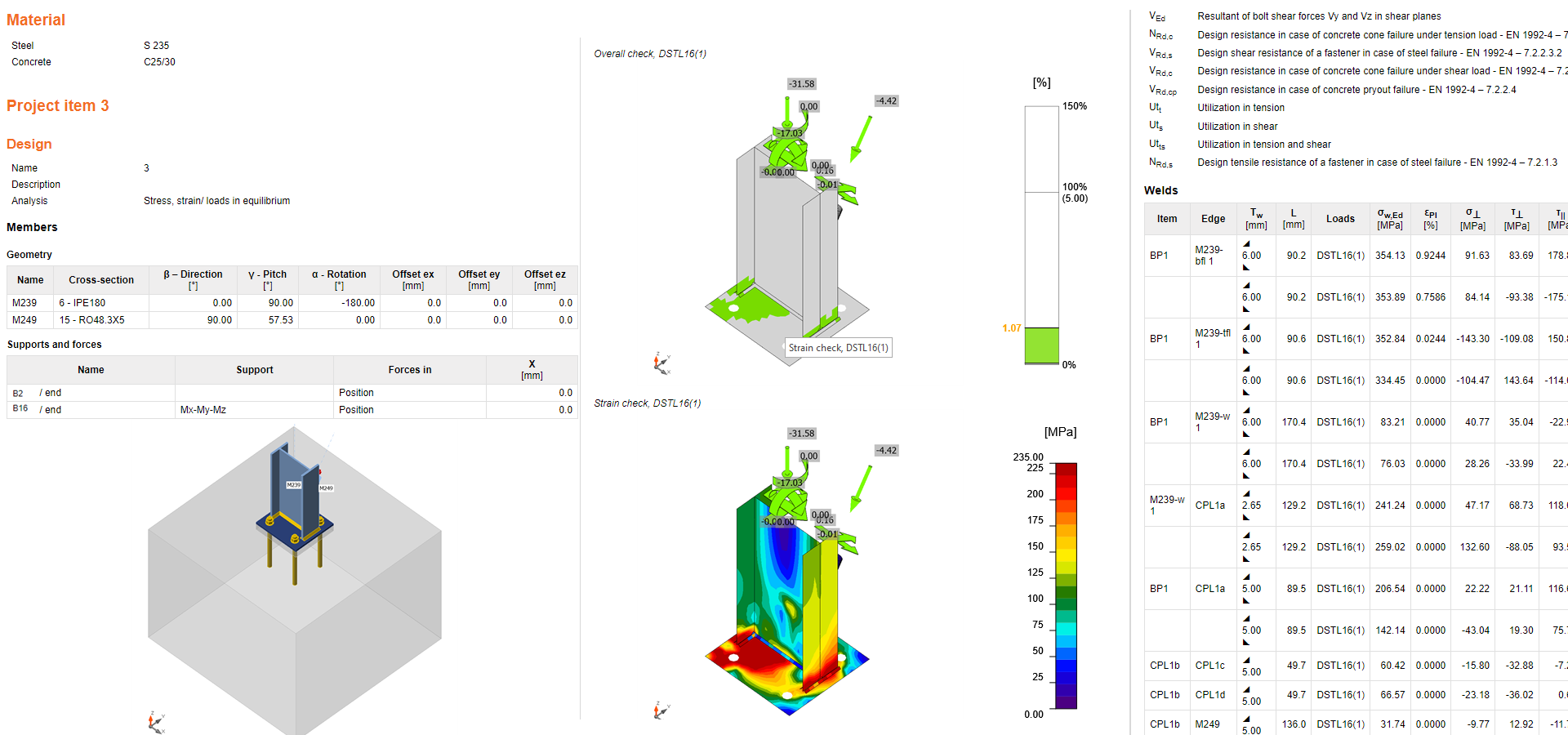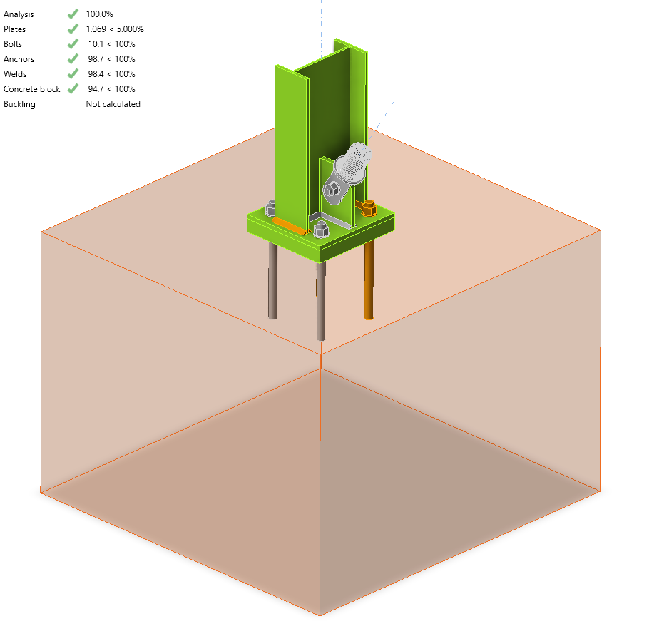 Puoi andare alla scheda Verifica per rivedere i risultati e dare un'occhiata più da vicino agli ancoraggi espandendo il calcolo utilizzando il simbolo "+". Puoi vedere che gli ancoraggi cedono in trazione nel blocco di calcestruzzo.
