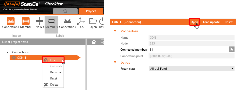 Nell'elenco degli elementi del progetto in Connessioni e con una connessione evidenziata in Checkbot puoi fare clic con il pulsante destro del mouse e selezionare Apri oppure fare clic sul comando Apri della barra multifunzione per avviare la progettazione, la verifica e la relazione.