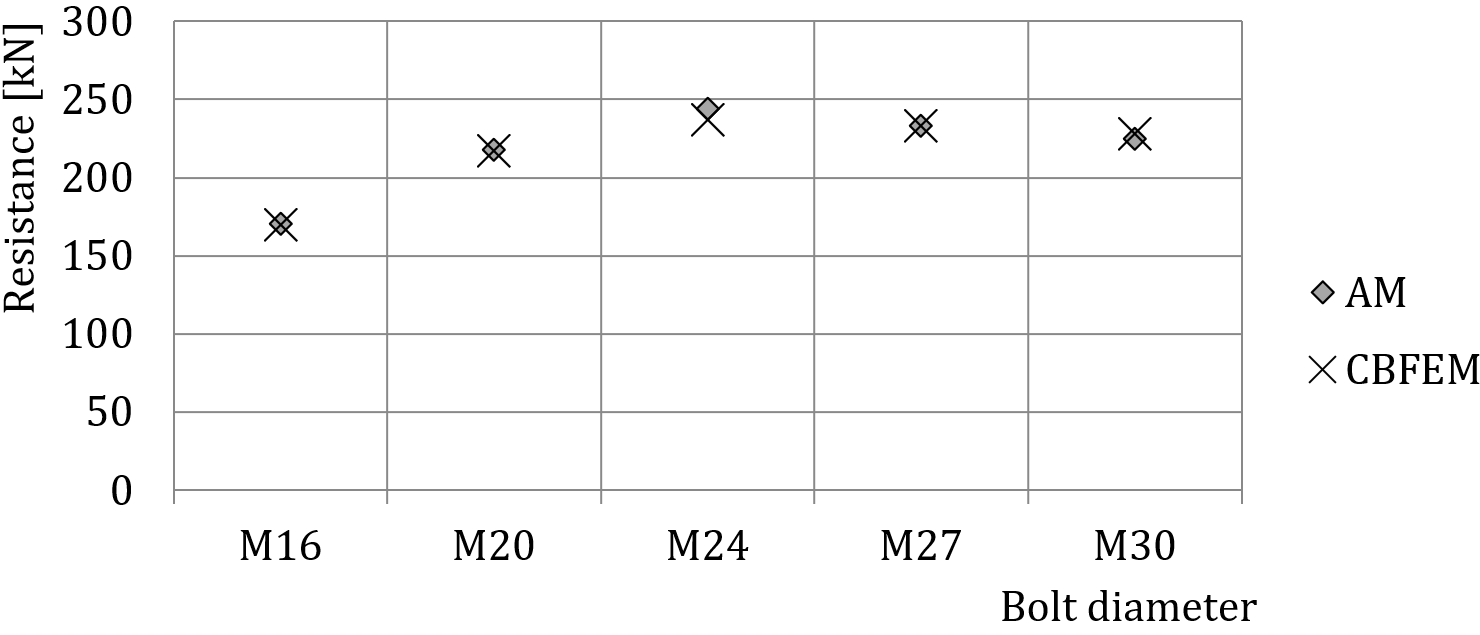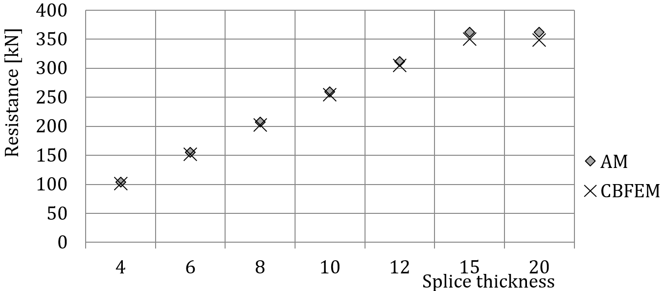 Design resistances calculated by CBFEM were compared with results of analytical model (AM). Results are summarised in Tab. 5.2.1. The parameters are bolt material, splice thickness, bolt diameter, and bolt distances, see Figs. 5.2.1 to 5.2.4.