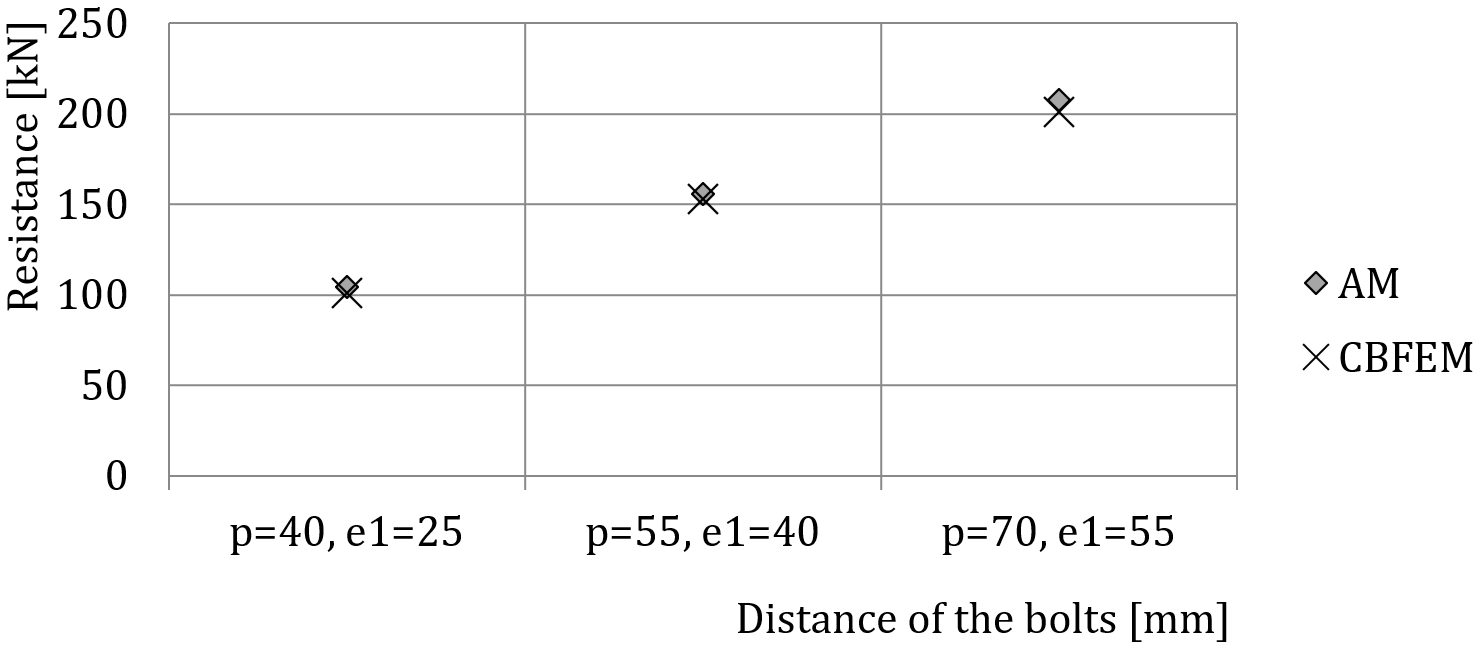 | Bolt spacing | Resistance [kN] | Critical component | Resistance [kN] | Critical component | |