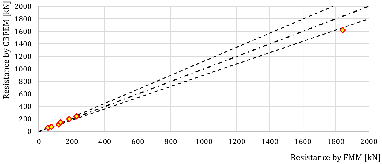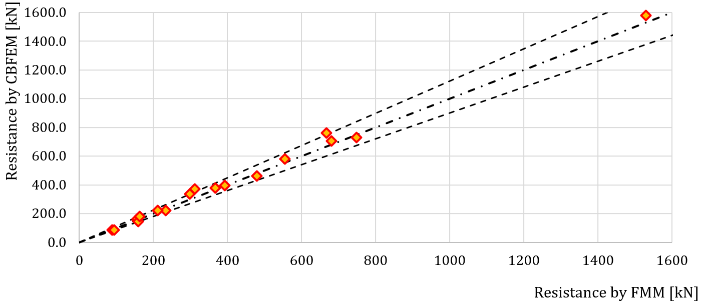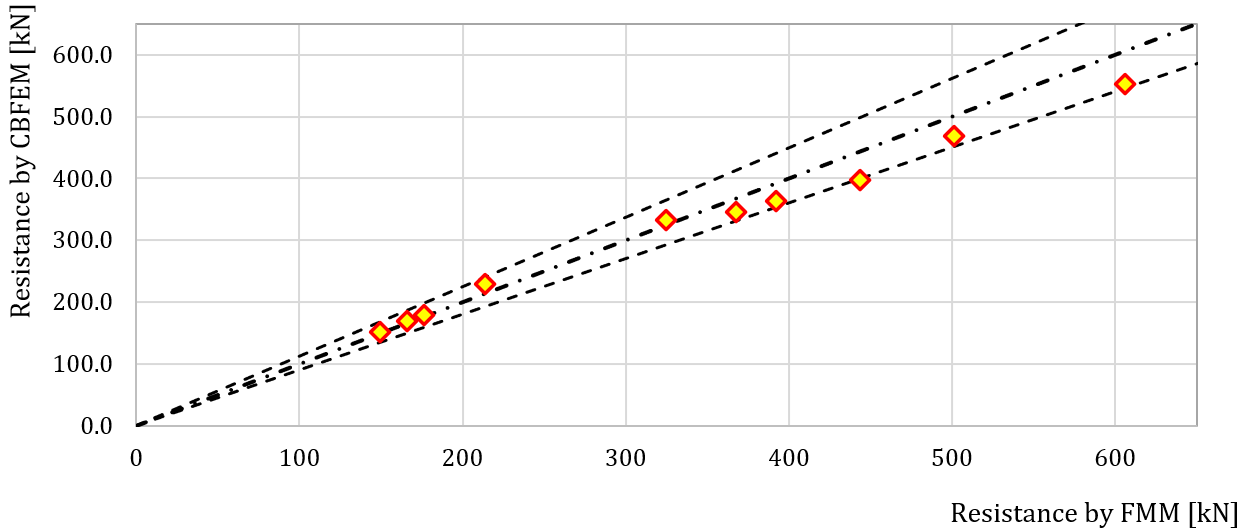 The study shows a good agreement for most of the applied load cases. The results are summarized in a diagram comparing CBFEM’s and FMM’s design resistances; see Fig. 7.1.7. The results show that the difference between the two calculation methods is in most cases less than 13%.