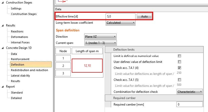 Linear deflection is calculated as a summation of all deflections of particular load cases (permanent, prestressing, and rheological) assigned for the selected combination. Deflection and internal forces are calculated for each load case separately, considering the actual static system with the support position defined in each construction stage.
