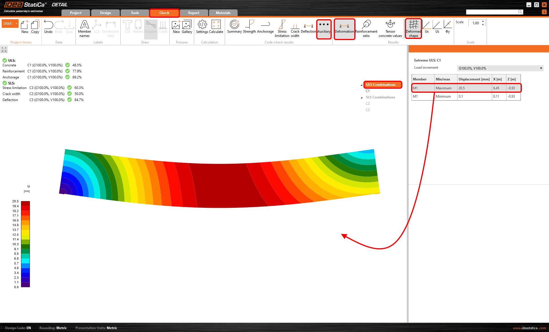 The deformation in the auxiliary is non-linearly calculated (plastic strains allowed) for ULS combinations and for individual load cases, as opposed to the deflection results, which are calculated linearly for the characteristic combinations. The creep coefficient is not considered in the auxiliary deformation results.