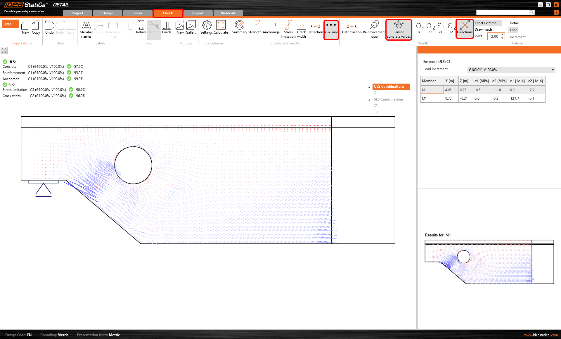 • Principal stresses in concrete σ1 and σ2. Note that the principal stress σ2 is the same stress presented in the Strength results.