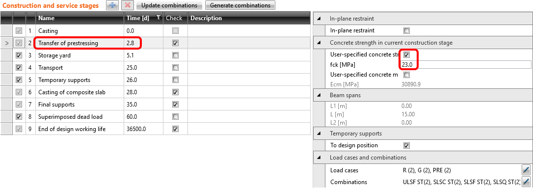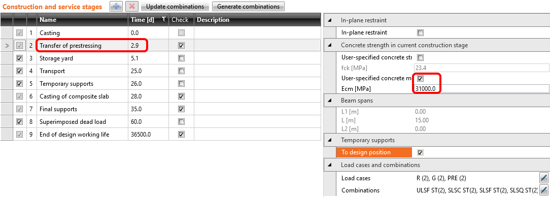 If you measure the development of parameters of concrete in time, you can specify their absolute values in the construction stage of prestressing in IDEA StatiCa Beam. The software automatically calculates the equivalent time for a given concrete parameter. This allows us to prestress concrete members with age under 3 days with the fast development of compressive strength or elastic modulus according to paragraph 3.1.2 (5).