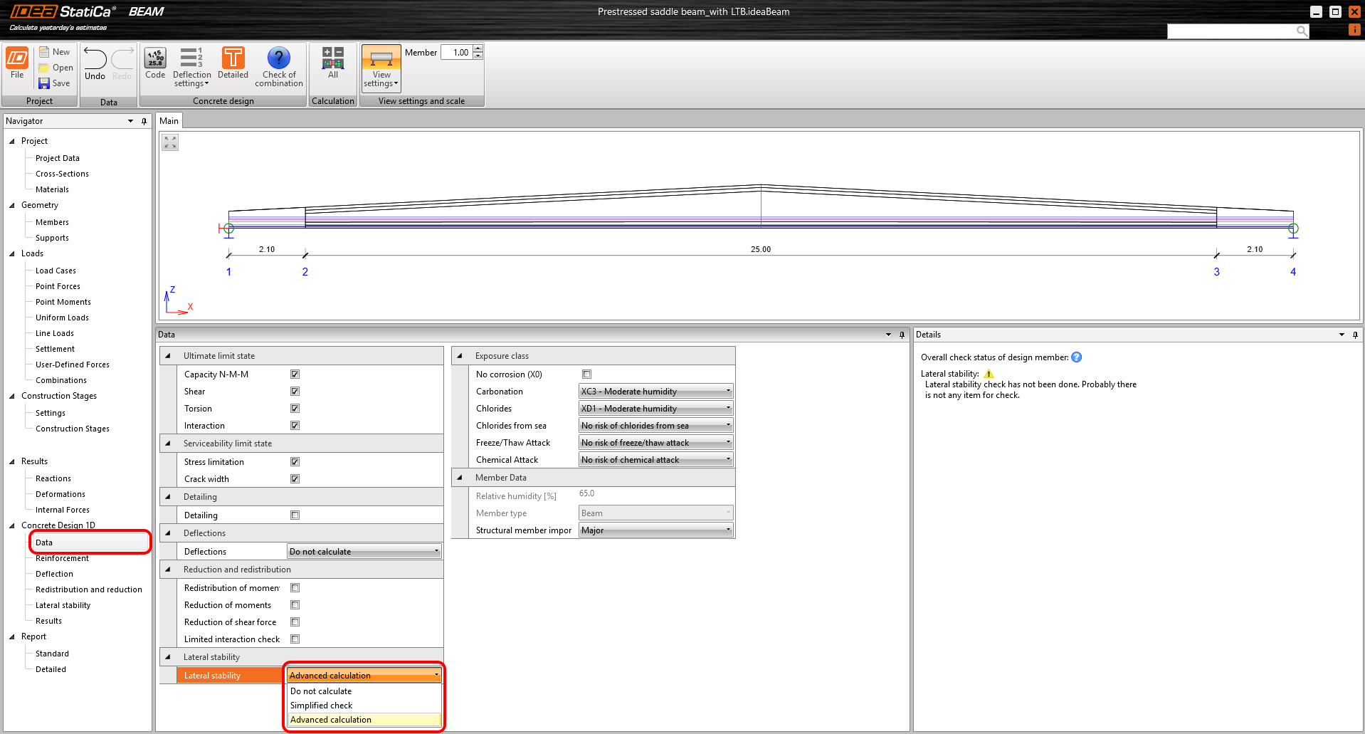 After you have finished modeling the geometry, prestressing, reinforcement, and loading in the application, you can calculate the model and proceed to the actual checks. The first step is to choose what you want to assess. This is done in the Concrete Design 1D – Data section. Here, you can also choose if you want to do a lateral stability check and what type of calculation will be used – simplified according to EN 1992-1-1 Cl. 5.9 or advanced.
