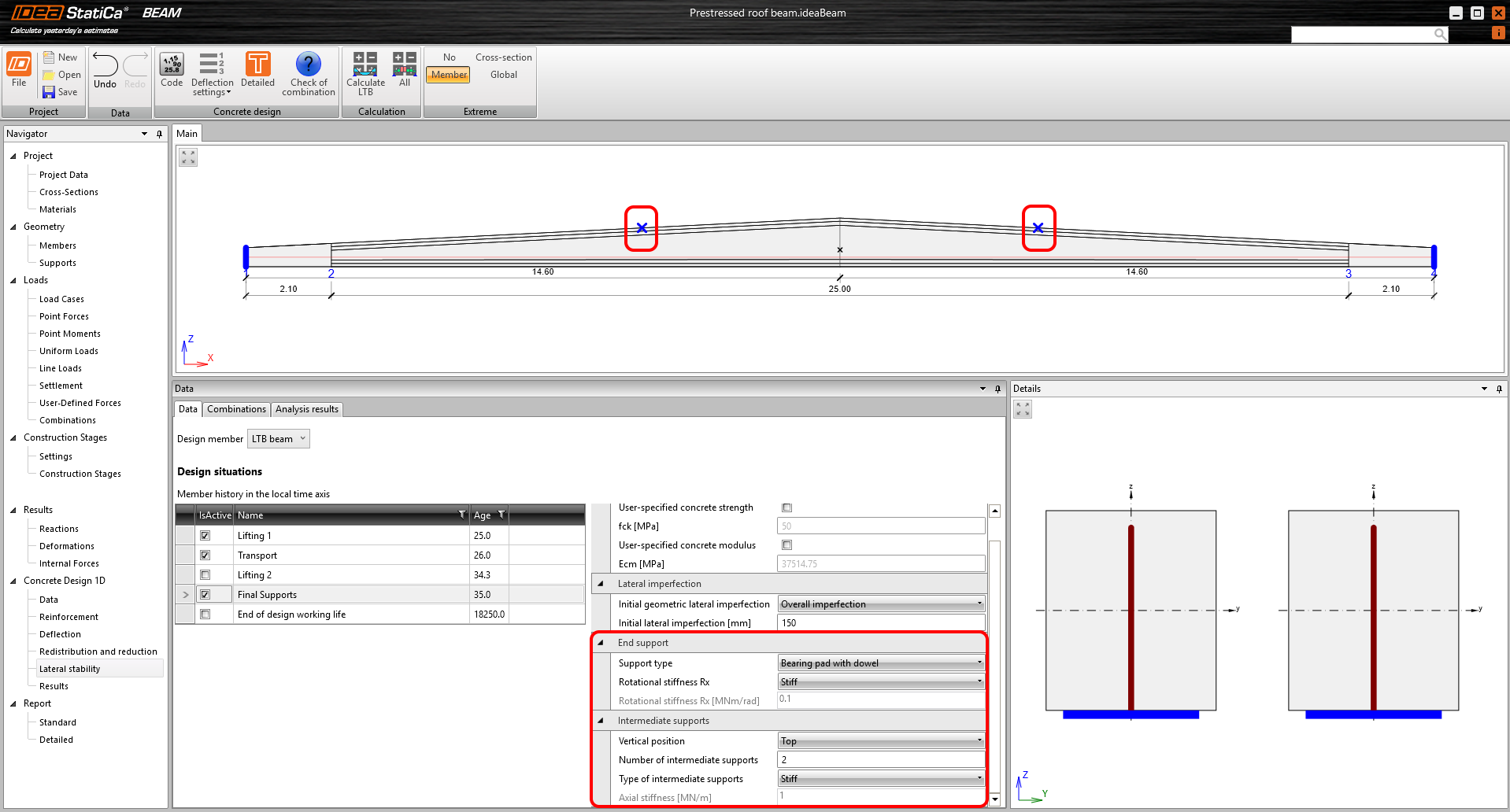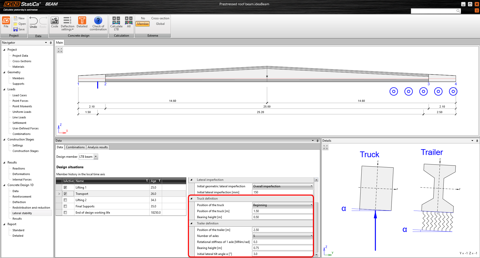 In IDEA StatiCa Beam, in addition to the simplified lateral stability assessment according to EN 1992-1-1 Cl. 5.9, a sophisticated materially and geometrically non-linear analysis can be performed to determine the design internal forces for several design situations – lifting, transport, final support, and end of design life. However, this type of analysis requires a significant amount of input, which we will explain in the following article.