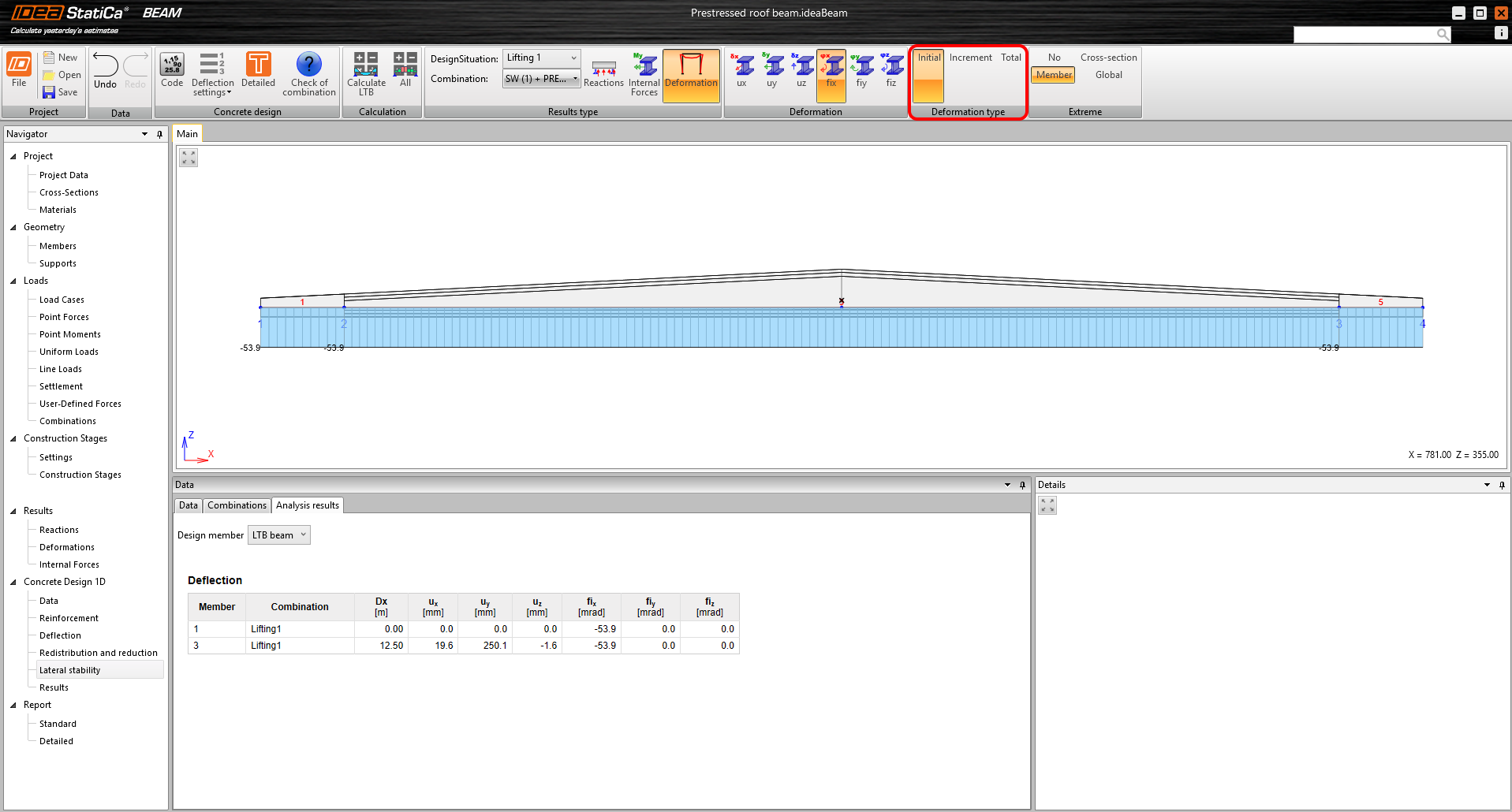 For the Transport, the situation is very similar: First, the deformed beam with the initial imperfection is rotated by the α angle, and placed on the supports (defined in the article above). Here the initial deformation is read. Then a non-linear calculation is run with the applied load (including shrinkage if the user specifies Geometric Imperfection, see above). The deformation as a result of the nonlinear calculation is again displayed as an increment. Total is the sum of Initial and Increment.
