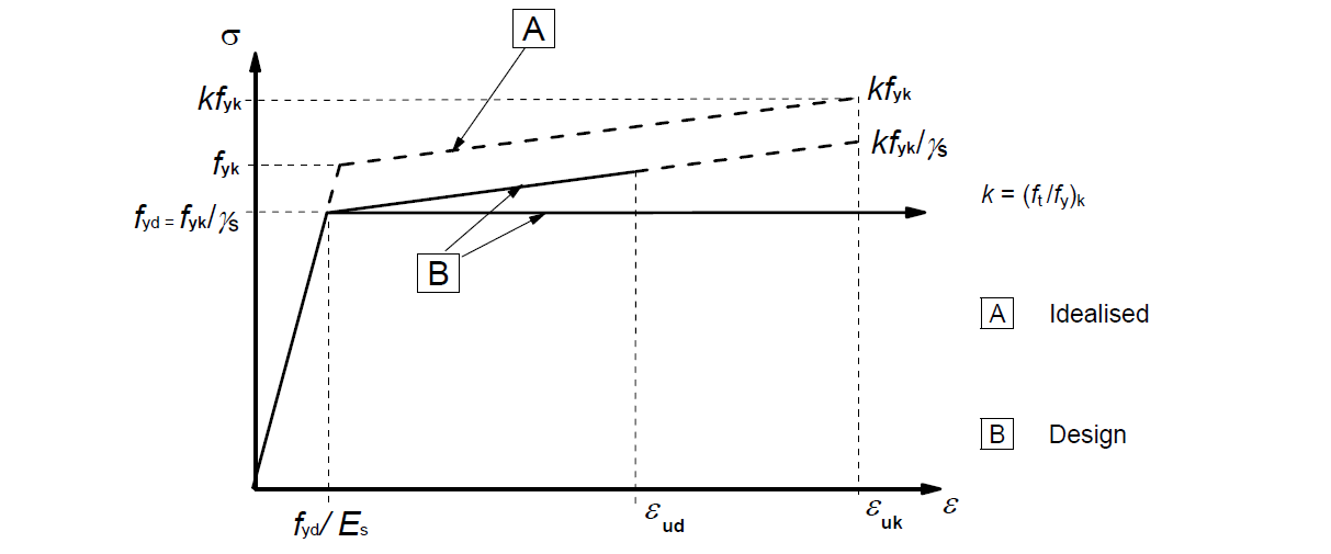 For reinforcement steel, the stress-strain diagram according to EN 1992-1-1 Cl.3.2.7 (2) is used. The user can choose whether a diagram with a horizontal or inclined top branch is used.