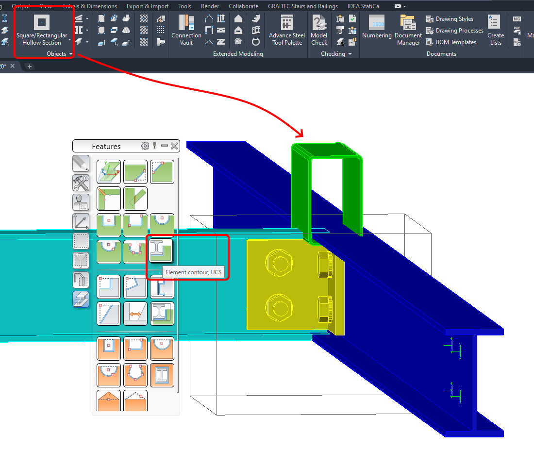 Il taglio dell'elemento secondo un altro elemento è il modo più semplice per gestire aperture o intagli. La cosa più semplice in Advance Steel è definire un nuovo elemento, la sezione roled HSS verde nell'esempio seguente. La trave verde è posizionata in modo da penetrare nella flangia superiore della trave perpendicolare azzurra. Con il comando Contorno elemento, UCS dalla palette degli strumenti di Advance Steel, viene definito il taglio.