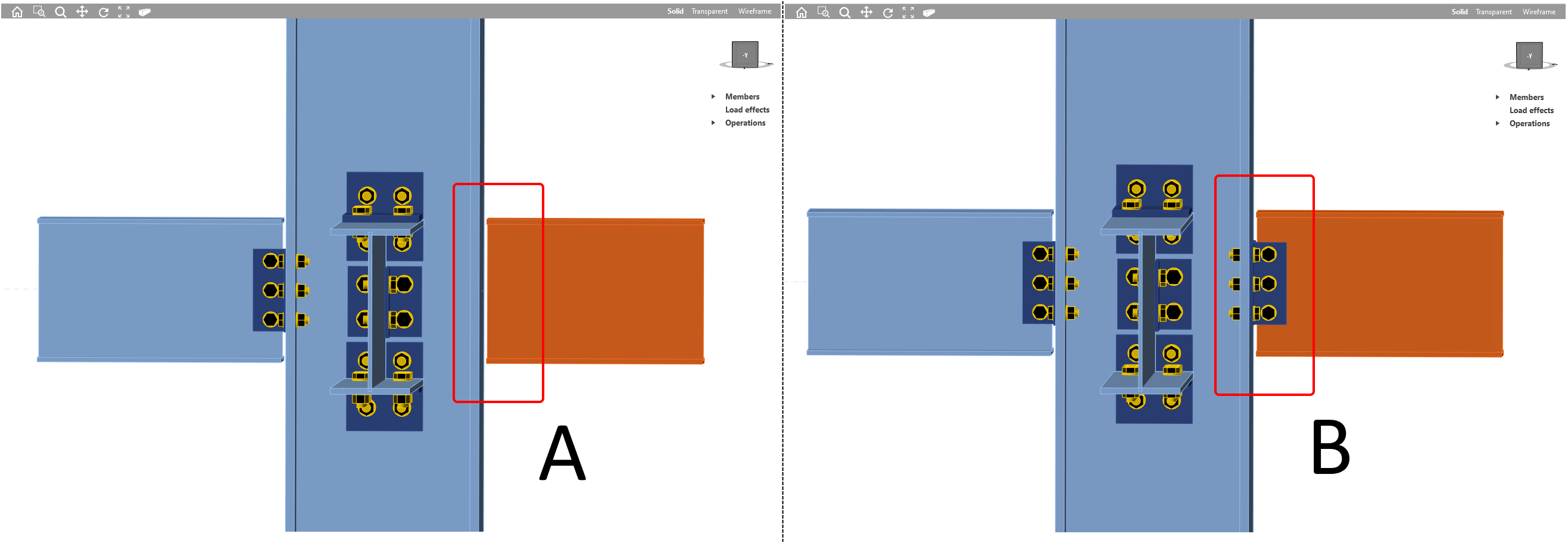 - Sincronizzazione - l'aggiornamento dei dati è un processo complesso. A volte possono verificarsi perdite di dati e si possono verificare situazioni come quella descritta nell'immagine seguente (esempio A), quando è stata elaborata una modifica della sezione trasversale della trave e i dati delle operazioni di produzione sono andati persi. Niente panico, sappiamo come risolvere il problema. Basta chiudere la finestra IDEA StatiCa Connection e anche la finestra di Code-check manager. Quindi lanciare nuovamente Code-check manager ed eseguire nuovamente il processo di sincronizzazione. In questo modo, i dati saranno ripristinati e tutte le operazioni di produzione saranno presenti e valide (esempio B).