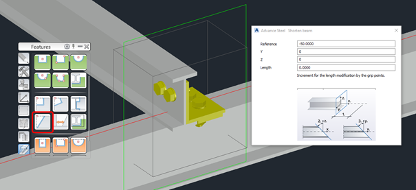 In IDEA StatiCa il centro della connessione è il nodo. Dal nodo, la lunghezza dell'elemento è determinata dal rettangolo di selezione (un modo automatico per determinare la lunghezza giusta dell'elemento). Nell'Advance Steel, l'entità trave deve essere accorciata o estesa con il comando Shorten.