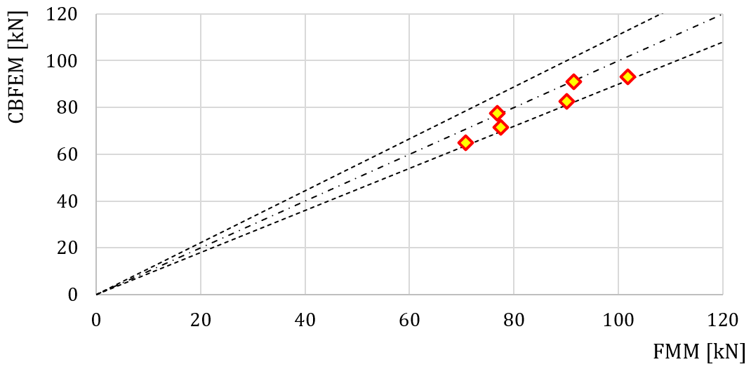 The study shows good agreement for the applied load cases. The results are summarized in a diagram comparing CBFEM’s and FMM’s design resistances; see Fig. 7.3.5. The results show that the difference between the two calculation methods is in all cases less than 7 %.