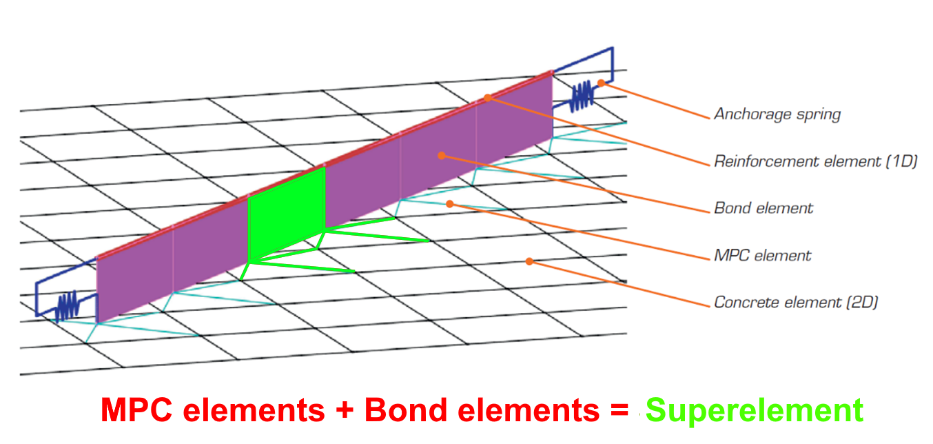 CSFM analysis is based on finite element methods. Concrete members and rebars are composed of finite 2D and 1D elements, respectively. At the same time, multi-point constraints (MPC) and bond elements together with springs at the ends of each rebar capture the interaction between concrete and reinforcement.