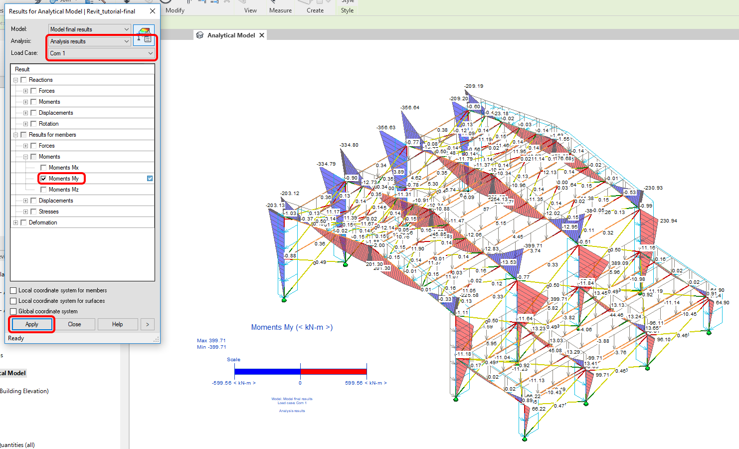 The window Results for Analytical Model is shown. Choose the Analysis results and Com1 (which represents the Combination 1 defined in advance), then Moments My from the Results for Members group. Proceed with Apply. The FEM analysis results are available and can be explored.